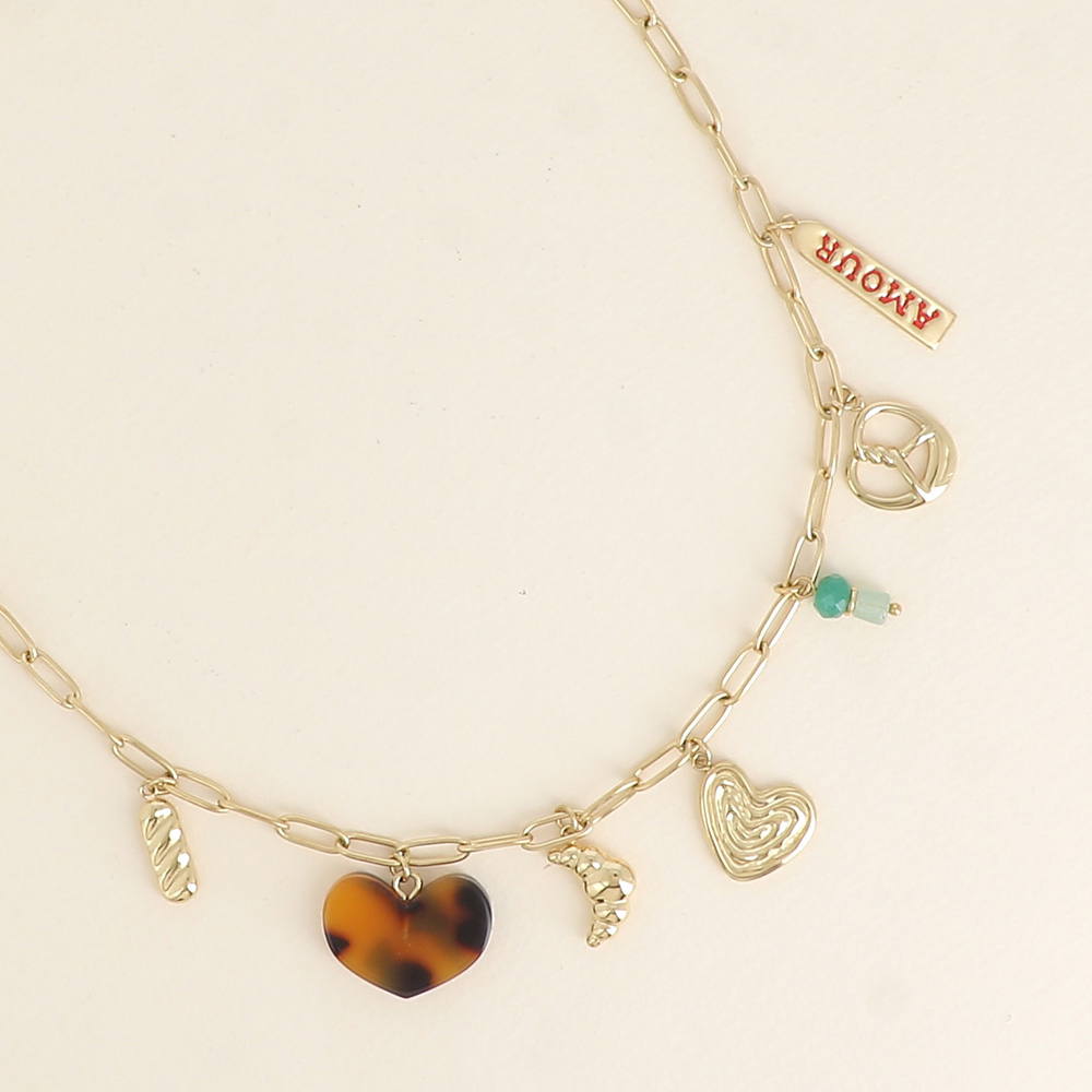 Armband met roestvrijstalen ketting bestaande uit verschillende hangers (hartjes, emaille plaatje met het woord AMOUR, croissant, stokbrood, pretzel en parels).