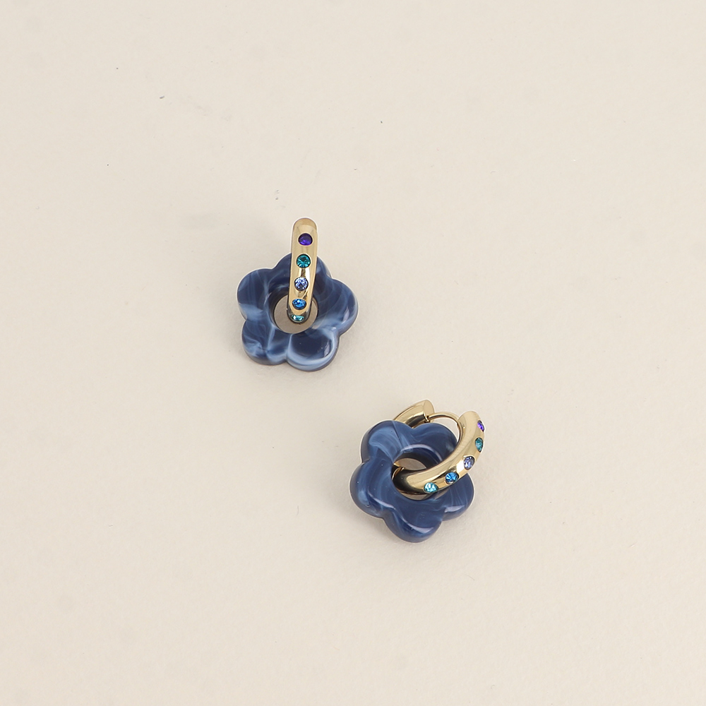 Creolen met scharnier sluiting van roestvrij staal, versierd met kleine zirkonia's en een bloem van hars.