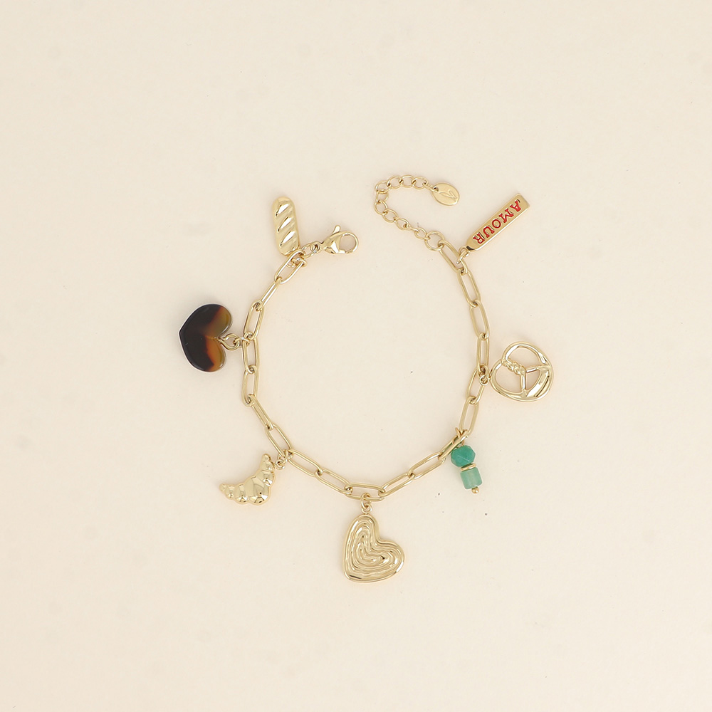 Ketting van roestvrij staal met verschillende hangers (hartjes, emaille plaatje met het woord AMOUR, halve maan, pretzel en parels).